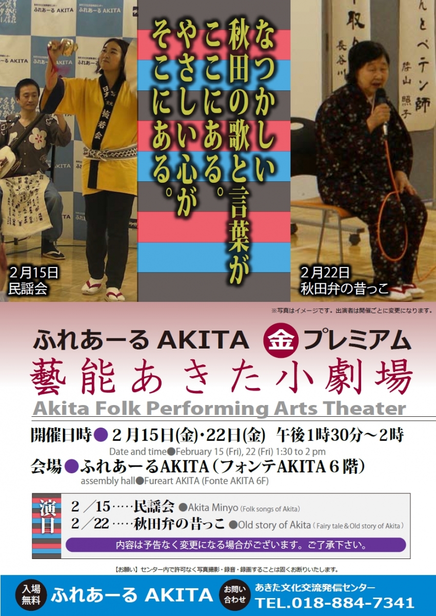 金(マルキン)プレミアム 藝能あきた小劇場 期間:2019年02月15日 気軽に秋田の文化に親しめるイベント「藝能あきた小劇場」は月2回、金曜日に開催いたします。ふれあーるAKITAで皆さまのご来場をお待ちしています!※都合により出演者が変更になる場合がございます。ご了承ください。 開催日時:2019年2月15日(金)13時30分~14時00分 会 場:フォンテAKITA6F あきた文化交流発信センター「ふれあーるAKITA」 演 目:民謡会 出 演:秋田梅若会 問合せ先:ふれあーるAKITA Tel 018-884-7341