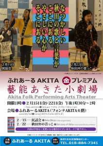 金(マルキン)プレミアム 藝能あきた小劇場 期間:2019年02月22日 気軽に秋田の文化に親しめるイベント「藝能あきた小劇場」は月2回、金曜日に開催いたします。ふれあーるAKITAで皆さまのご来場をお待ちしています!※都合により出演者が変更になる場合がございます。ご了承ください。 開催日時:2019年2月22日(金)13時30分~14時00分 会 場:フォンテAKITA6F あきた文化交流発信センター「ふれあーるAKITA」 演 目:民謡会 出 演:あきた民話の会 問合せ先:ふれあーるAKITA Tel 018-884-7341