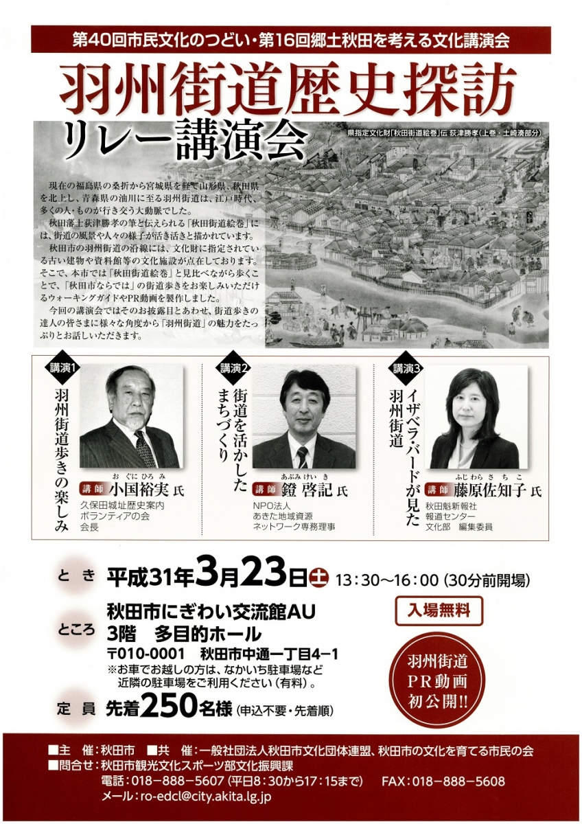 羽州街道歴史探訪リレー講演会 期間:2019年03月23日 開催日:2019年3月23日(土) 時 間:13:30~16:00(30分前開場) 会 場:にぎわい交流館AU 3F 多目的ホール 入 場:無料 定 員:先着250名様(申込不要・先着順) 問合せ:秋田市観光文化スポーツ部文化振興課 TEL 018-888-5607(平日8:30から17:15まで) FAX 018-888-5608 mail ro-edcl@city.akita.lg.jp