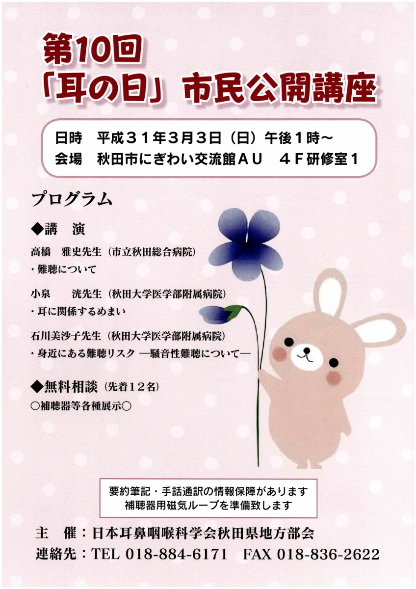 第10回「耳の日」市民公開講座 期間:2019年03月03日 開催日:2019念3月3日(日) 時 間:13:00~ 会 場:にぎわい交流館AU 4F 研修室1 参 加:無料相談(先着12名) 主 催:日本耳鼻咽喉科学会秋田県地方部会 連絡先:TEL 018-884-6171 / FAX 018-836-2622