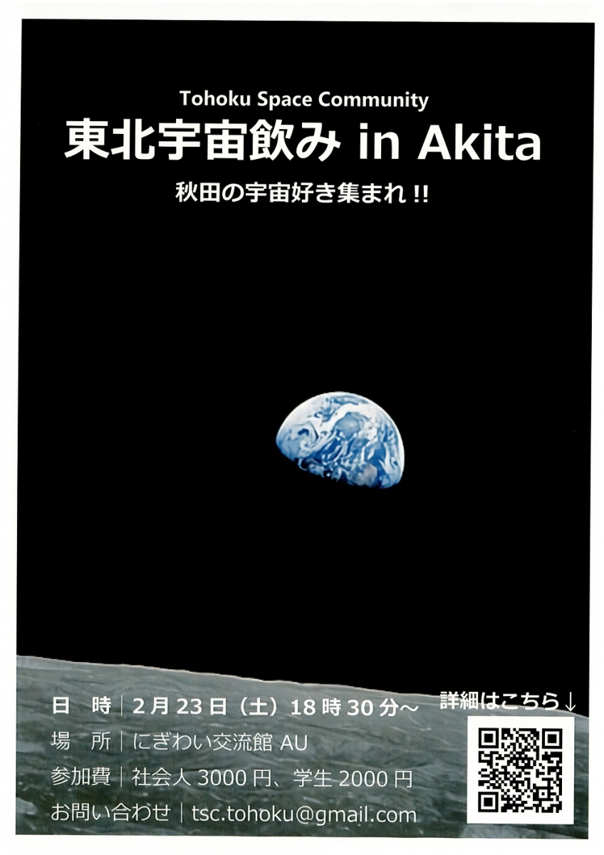 Tohoku Space Community 東北宇宙飲み in Akita 期間:2019年02月23日 開催日:2019年2月23日(土) 時 間:18:30~ 会 場:にぎわい交流館AU 2F アート工房1 参加費:社会人 3,000円、学生2,000円 問合せ:tsc.tohoku@gmail.com