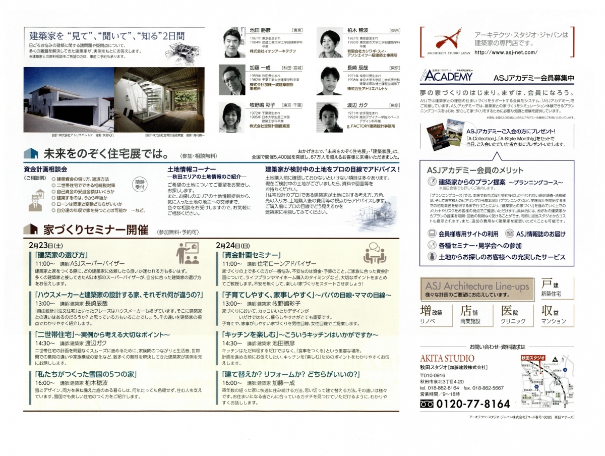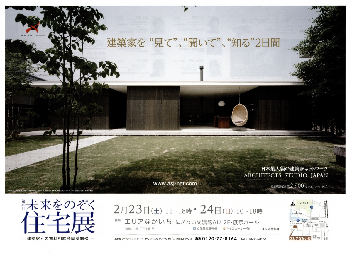 第49回未来をのぞく住宅展-建築家との無料相談会同時開催- 期間:2019年02月23日 ~ 2019年02月24日 開催日:2019年2月23日(土) 11:00~18:00 2月24日(日) 10:00~18:00 会 場:にぎわい交流館AU 2F 展示ホール 入 場:無料 問合せ:アーキテクツ・スタジオ・ジャパン 秋田スタジオ 0120-77-8164 / 018-862-8264 www.asj-net.com