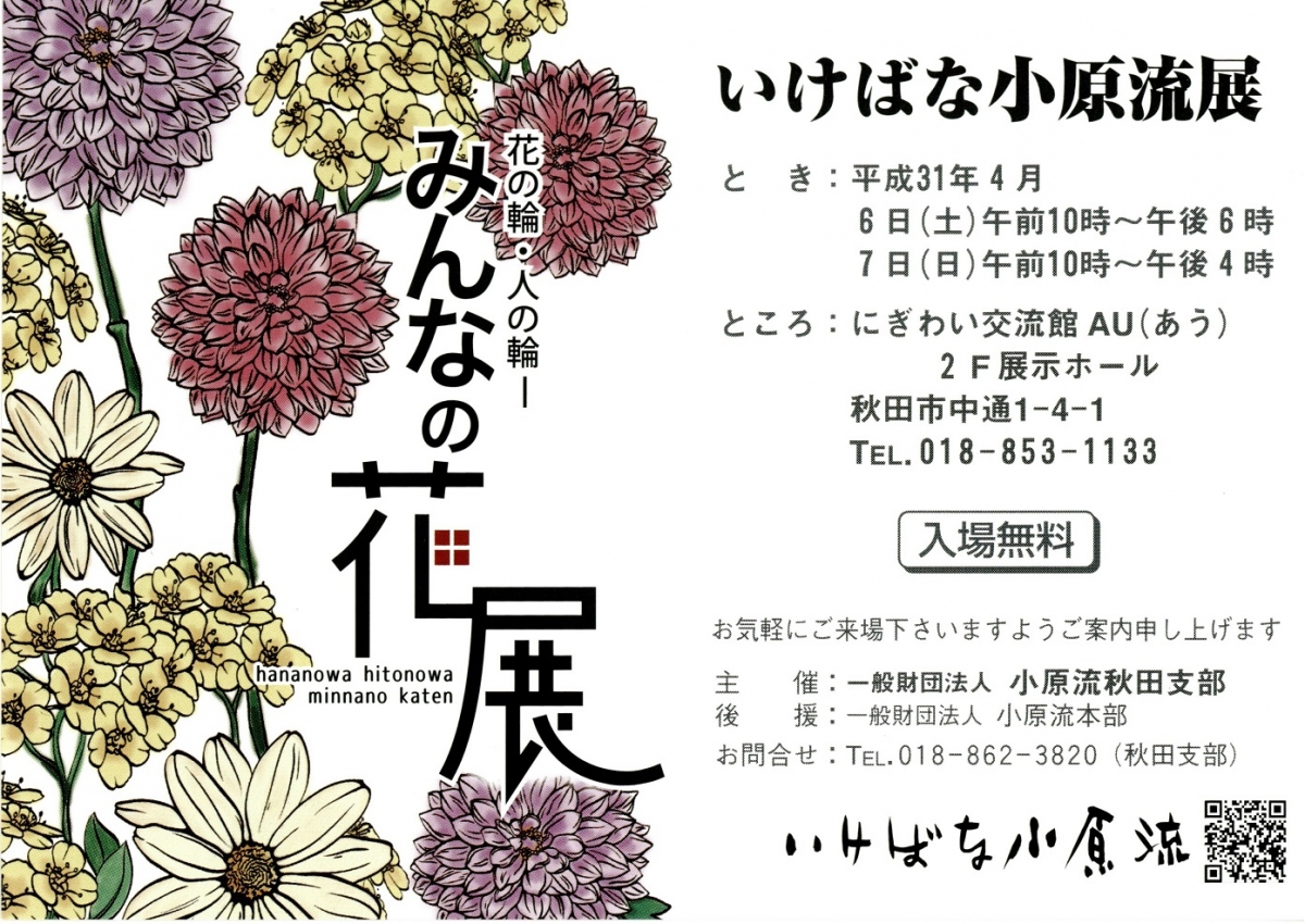いけばな小原流展 花の輪・人の輪-みんなの花展 期間:2019年04月06日 ~ 2019年04月07日 開催日:2019年4月6日(土) 10:00~18:00 4月7日(日) 10:00~16:00 会 場:にぎわい交流館AU 2F 展示ホール 入 場:無料 主 催:一般財団法人 小原流秋田支部 問合せ:TEL 018-862-3820(秋田支部)