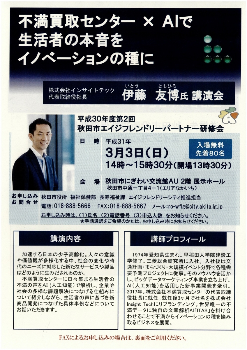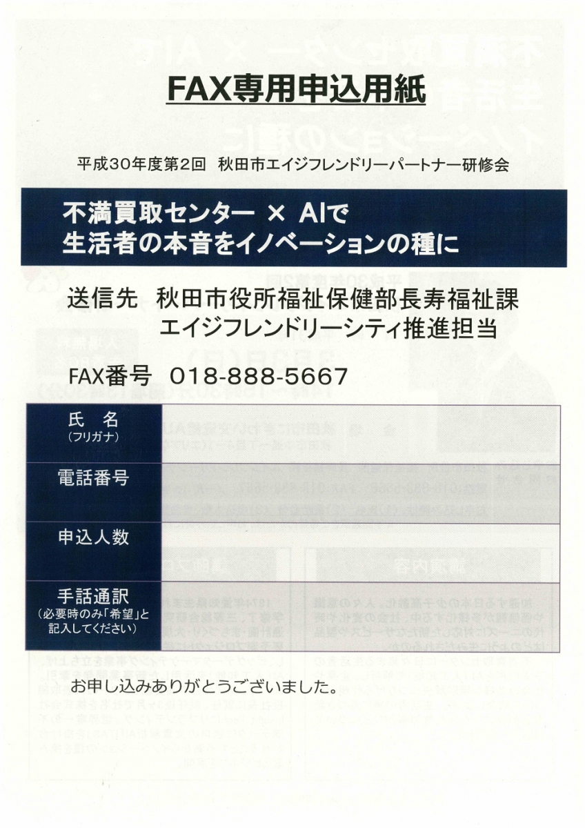 - 問合せ・申込:秋田市役所 福祉保健部 長寿福祉課 エイジフレンドリーシティ推進担当