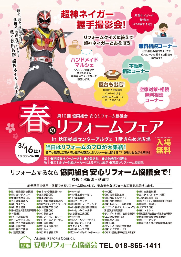 第10回春のリフォームフェア 期間:2019年03月16日 開催日:2019年3月16日(土) 時 間:10時00分~16時00分 会 場:秋田拠点センターアルヴェ1階 きらめき広場 入場料:無料 問合せ先:安心リフォーム協議会 TEL 018-865-1411 ☆当日はリフォームのプロが大集結します!