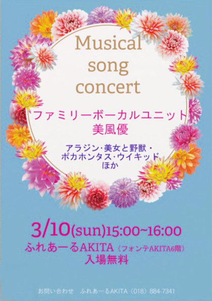 Musical song concert ~ミュージカルソングコンサート~ 期間:2019年03月10日 茂木美竹ミュージック・ルーム主宰者とその家族で構成されたユニットが登場します。 コンクールでグランプリを獲得した歌声をお楽しみ下さい。 主な曲目は「美女と野獣」「ポカホンタス」「ウィキッド」ほか。 開催日:2019年3月10日(日) 時 間:15時00分~16時00分 会 場:フォンテAKITA6F あきた文化交流発信センター「ふれあーるAKITA」 企 画:ファミリーボーカルユニット美風優(茂木美竹ミュージック・ルーム) 問合せ先:ふれあーるAKITA Tel 018-884-7341