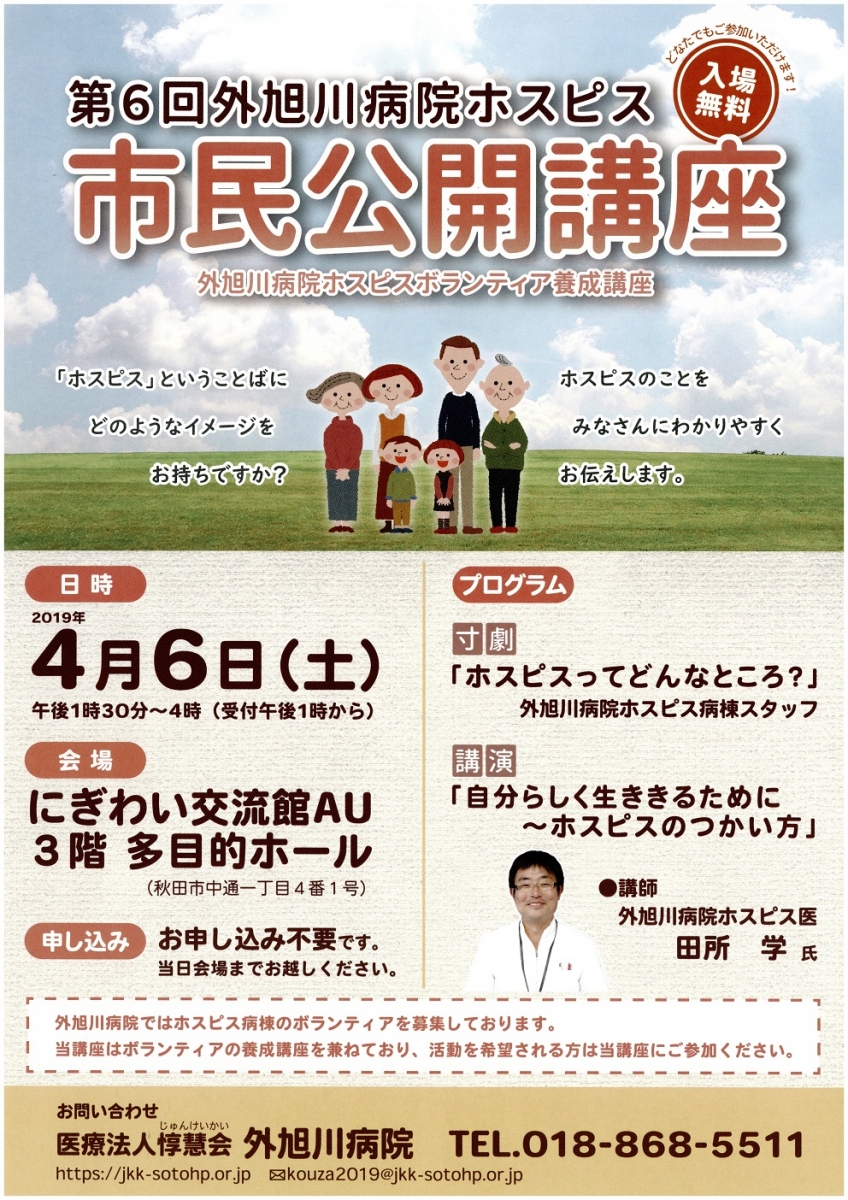 第6回外旭川病院ホスピス 市民公開講座 期間:2019年04月06日 開催日:2019年4月6日(土) 時 間:13:30~16:00(受付13:00から) 会 場:にぎわい交流館AU 3F 多目的ホール 入 場:無料 お申し込み不要です。当日会場までお越しください。 問合せ:医療法人惇慧会 外旭川病院 TEL 018-868-5511 HP https://jkk-sotohp.or.jp mail kouza2019@jkk-sotohp.or.jp