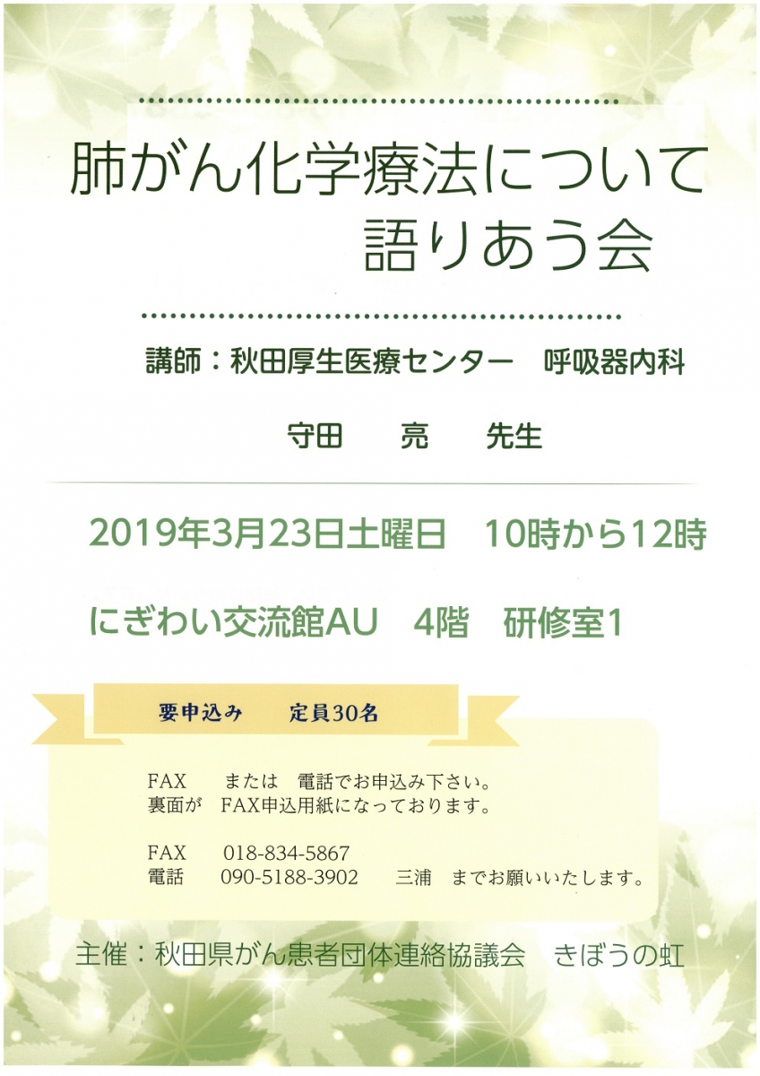 肺がん化学療法について語りあう会 期間:2019年03月23日 開催日:2019年3月23日(土) 時 間:10:00~12:00 会 場:にぎわい交流館AU 4F 研修室1 申 込:FAX または 電話でお申込み下さい。 FAX申込用紙 FAX 018-834-5867 電話 090-5188-3902 三浦 までお願いいたします。 定 員:30名 主 催:秋田県がん患者団体連絡協議会 きぼうの虹
