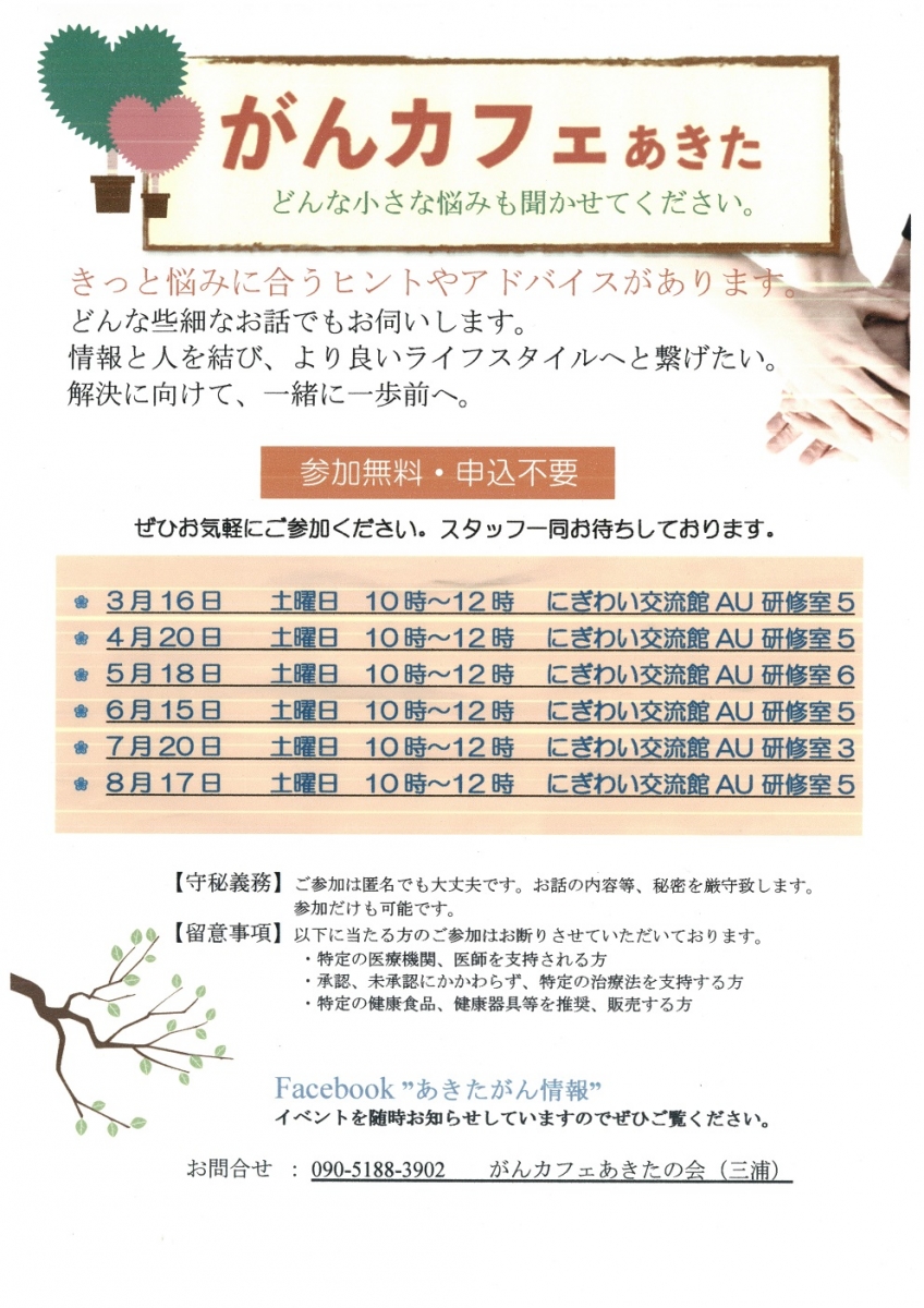 がんカフェあきた 期間:2019年05月18日 2019年開催スケジュール〈会場:にぎわい交流館AU〉・5月18日(土) 10:00~12:00 4F 研修室6・6月15日(土) 10:00~12:00 4F 研修室5・7月20日(土) 10:00~12:00 4F 研修室3・8月17日(日) 10:00~12:00 4F 研修室5 参 加:無料 申込不要 問合せ:090-5188-3902 がんカフェあきたの会(三浦)