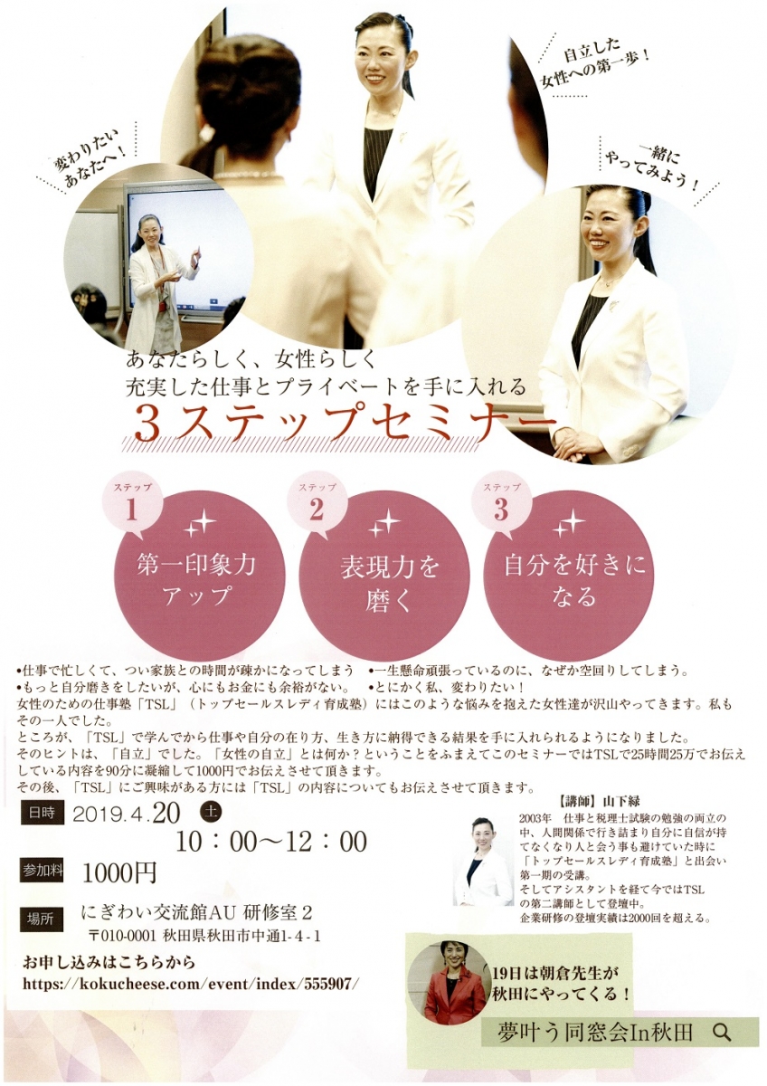 3ステップセミナー 期間:2019年04月20日 開催日:2019年4月20日(土) 時 間:10:00~12:00 会 場:にぎわい交流館AU 4F 研修室2 参加費:¥1,000 申 込:https://kokucheese.com/event/index/555907/