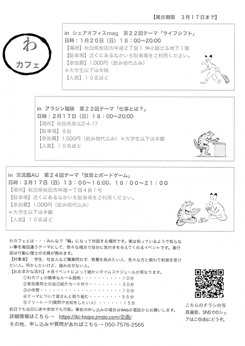 わカフェ 第24回テーマ「教育とボードゲーム」 期間:2019年03月17日 開催日:2019年3月17日(日) 時 間:13:00~16:00、18:00~21:00 会 場:にぎわい交流館AU 4F 和室2 参加費:1,000円(飲み物代込み) ※大学生以下は半額 人 数:10名ほど 申 込:050-7576-2565 詳細情報 https://itc-hojyo.jimdo.com/企画/