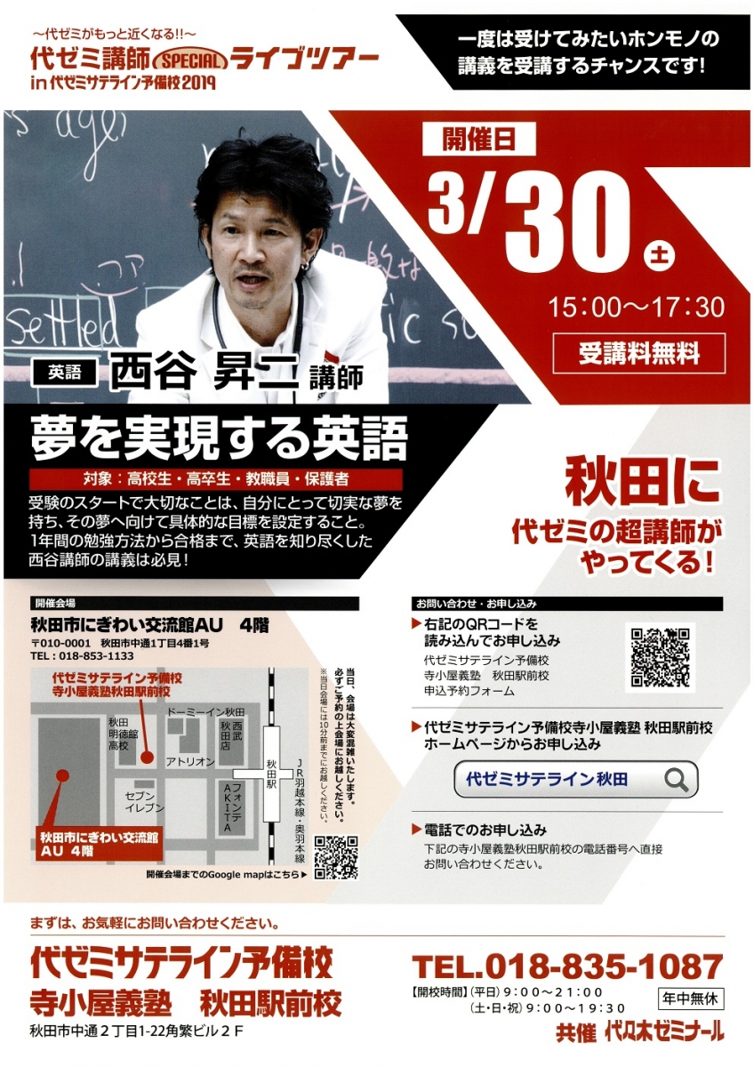 代ゼミ講師SPECIALライブツアー in 代ゼミサテライン予備校2019 期間:2019年03月30日 開催日:2019年3月30日(土) 時 間:15:00~17:30 会 場:にぎわい交流館AU 4F 研修室1・2 受講料:無料 問合せ:代ゼミサテライン予備校 寺子屋義塾 秋田駅前校 TEL 018-835-1087 [開校時間](平日)9:00~21:00/(土・日・祝)9:00~19:30 年中無休 http://www.sateyobiakita.jp/