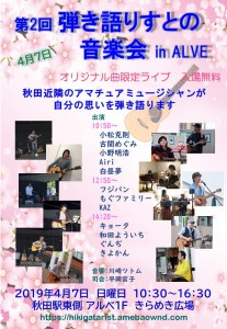 第2回 弾き語りすとの音楽会 in ALVE 期間:2019年04月07日 開催日:2019年4月7日 時 間:10:30~16:30 会 場:秋田駅東側 アルヴェ1F きらめき広場 入場料:無料 問合せ先:弾き語りすとの音楽会 TEL 090-1065-5797