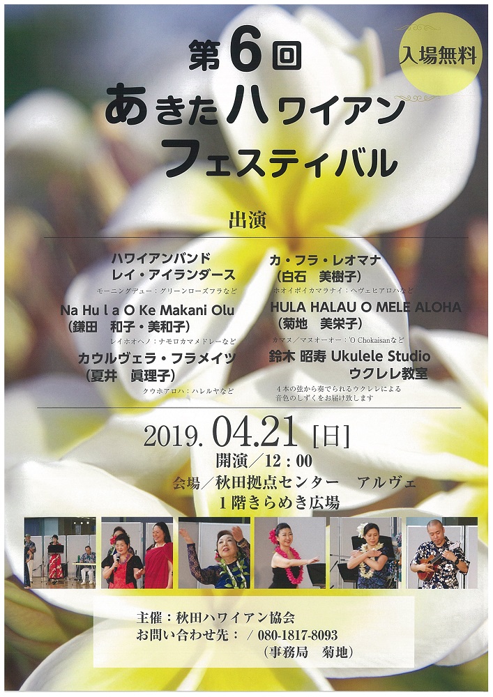 第6回あきたハワイアンフェスティバル 期間:2019年04月21日 開催日:2019年4月21日(日) 時 間:12:00~ 会 場:秋田拠点センターアルヴェ1階 きらめき広場 入場料:無料 問合せ先:秋田ハワイアン協会 TEL 080-1817-8093