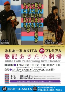 金(マルキン)プレミアム 藝能あきた小劇場 期間:2019年04月19日 気軽に秋田の文化に親しめるイベント「藝能あきた小劇場」は月2回、金曜日に開催いたします。ふれあーるAKITAで皆さまのご来場をお待ちしています!※都合により出演者が変更になる場合がございます。ご了承ください。 開催日:2019年4月19日(金) 時 間:13:30~14:00 会 場:フォンテAKITA6F あきた文化交流発信センター「ふれあーるAKITA」 演 目:秋田弁の昔っこ 出 演:あきた民話の会 入場料:無料 問合せ先:ふれあーるAKITA Tel 018-884-7341