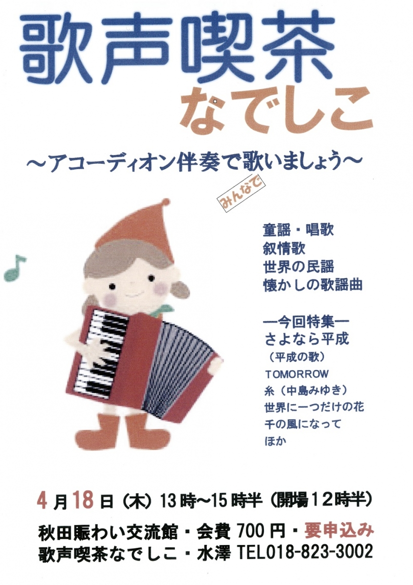 歌声喫茶なでしこ~~アコーディオン伴奏でみんなで歌いましょう~ 期間:2019年04月18日 開催日:2019年4月18日(木) 時 間:13:00~15:30(開場12:30) 会 場:にぎわい交流館AU 3F ミュージック工房1 会 費:700円 要申込み 問合せ:歌声喫茶なでしこ・水澤 TEL 018-823-3002
