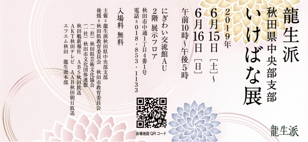 龍生派秋田県中央部支部 いけばな展 期間:2019年06月15日 ~ 2019年06月16日 開催日:2019年6月15日(土)・16日(日) 時 間:10:00~17:00 会 場:にぎわい交流館AU 2F 展示ホール 入 場:無料 主 催:龍生派秋田県中央部支部