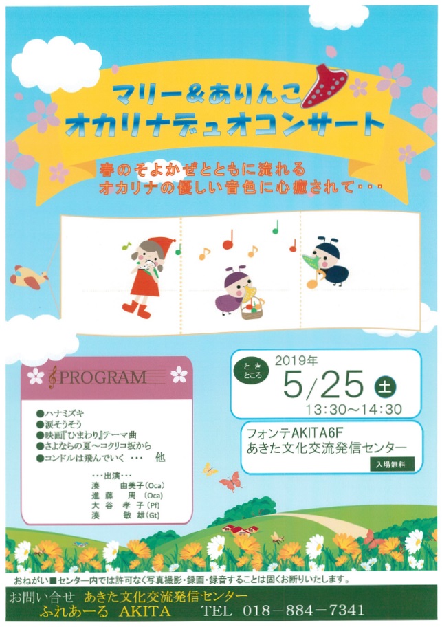 マリー&ありんこ オカリナデュオコンサート 期間:2019年05月25日 オカリナ2本のアンサンブルで「音の会話」の様に楽しく美しいハーモニーを皆様にお届けします。 主な曲目は「ハナミズキ」「涙そうそう」「さよならの夏」ほか。 開催日:2019年5月25日(土) 時 間:13:30 ~14:30 会 場:フォンテAKITA6F あきた文化交流発信センター「ふれあーるAKITA」 企 画:マリー&ありんこ 問合せ先:ふれあーるAKITA Tel 018-884-7341