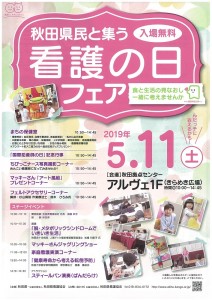 看護の日フェア 期間:2019年05月11日 開催日:2019年5月11日(土) 時 間:10:00~14:45 会 場:秋田拠点センターアルヴェ1階 きらめき広場 入場料:無料 問合せ先:公益社団法人 秋田県看護協会 TEL 018-834-0172
