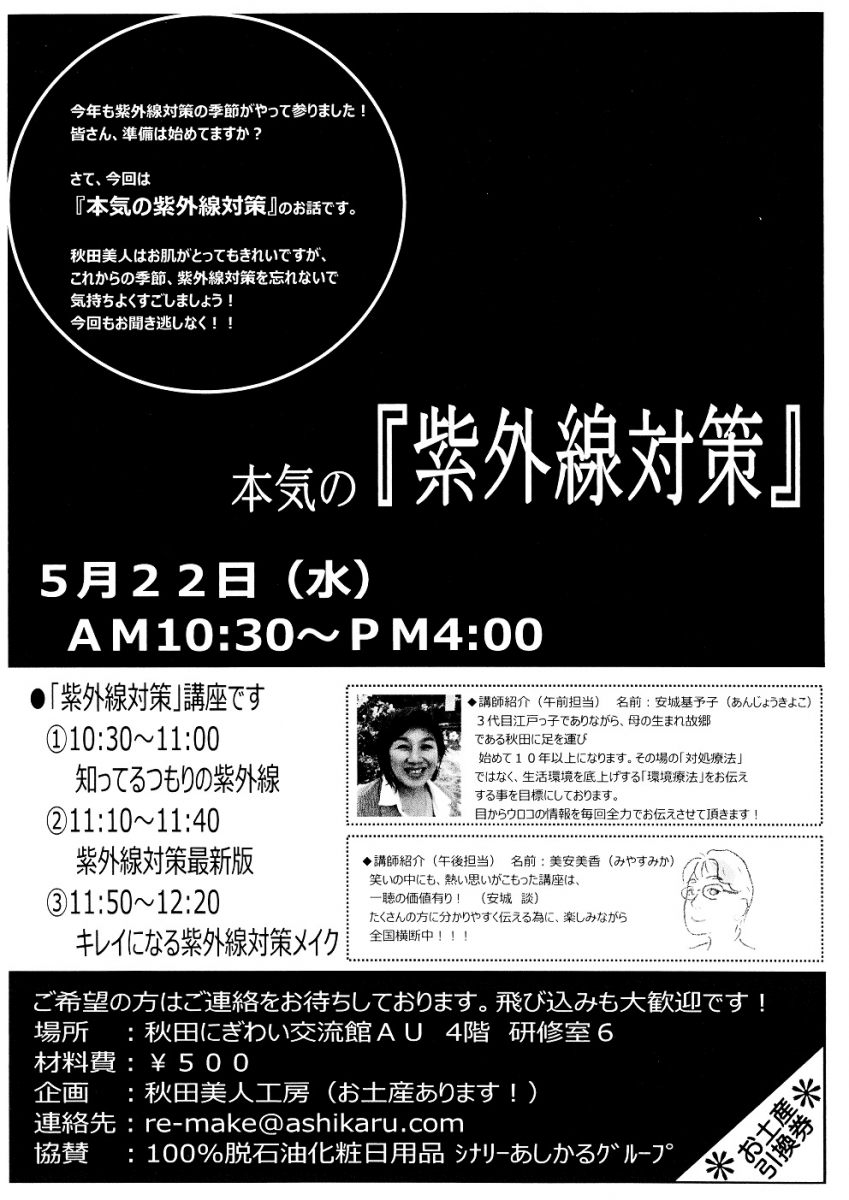 本気の『紫外線対策』 期間:2019年05月22日 開催日:2019年5月22日(水) 時 間:10:30~16:00 会 場:にぎわい交流館AU 4F 研修室6 材料費:¥500 企 画:秋田美人工房(お土産あります!) 連絡先:re-make@ashikaru.com