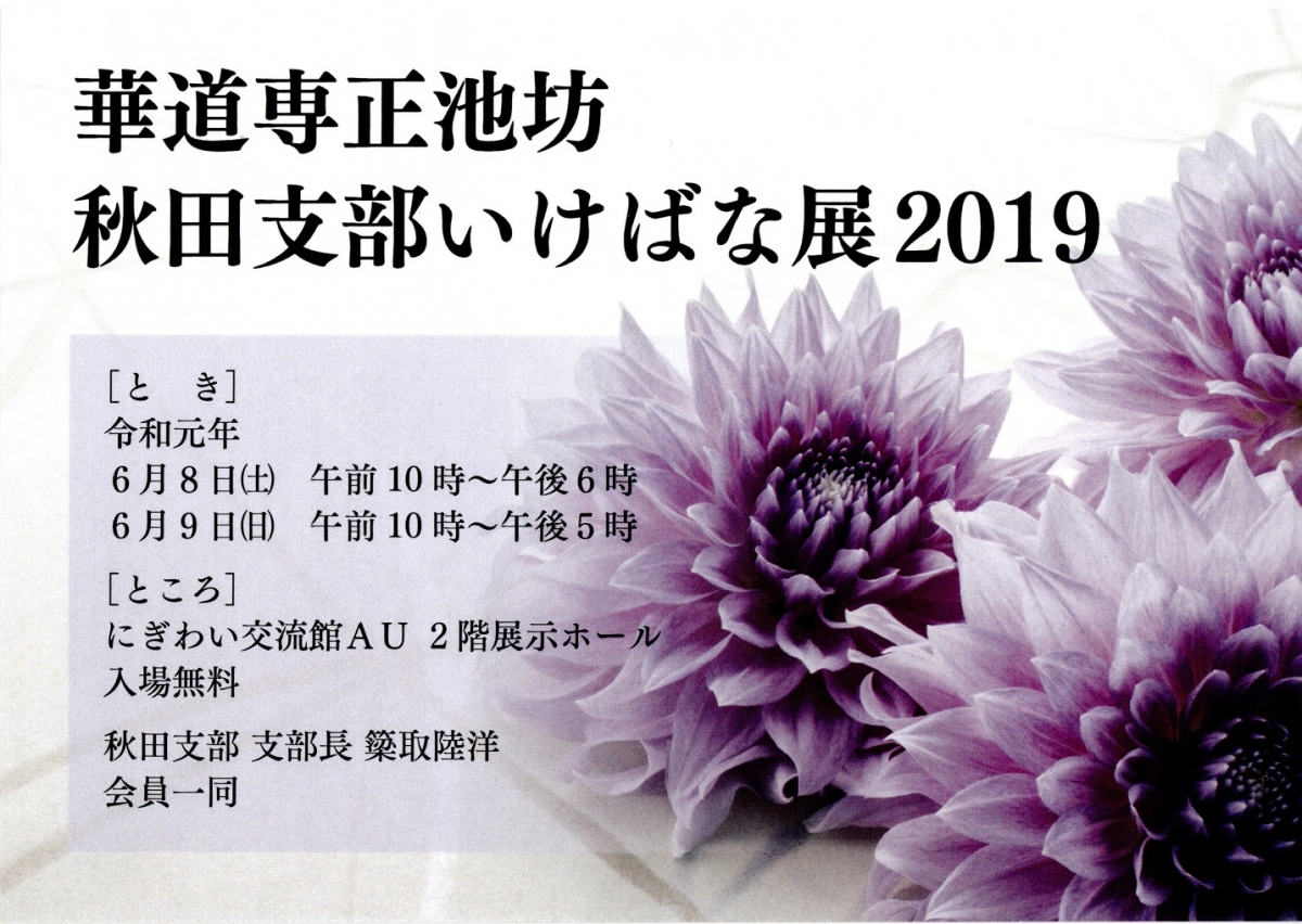 華道専正池坊 秋田支部いけばな展2019 期間:2019年06月08日 ~ 2019年06月09日 開催日:2019年6月8日(土) 10:00~18:00 6月9日(日) 10:00~17:00 会 場:にぎわい交流館AU 2F 展示ホール 入 場:無料 主 催:華道専正池坊秋田支部