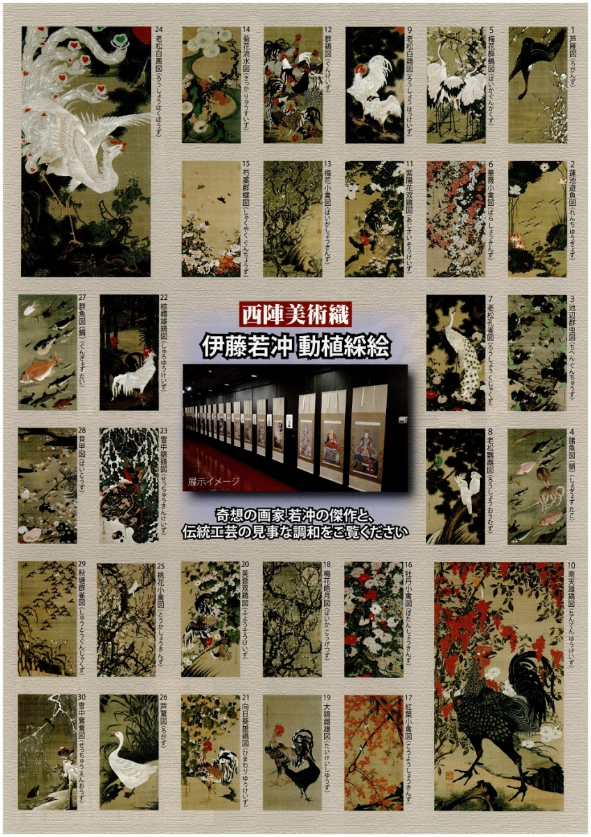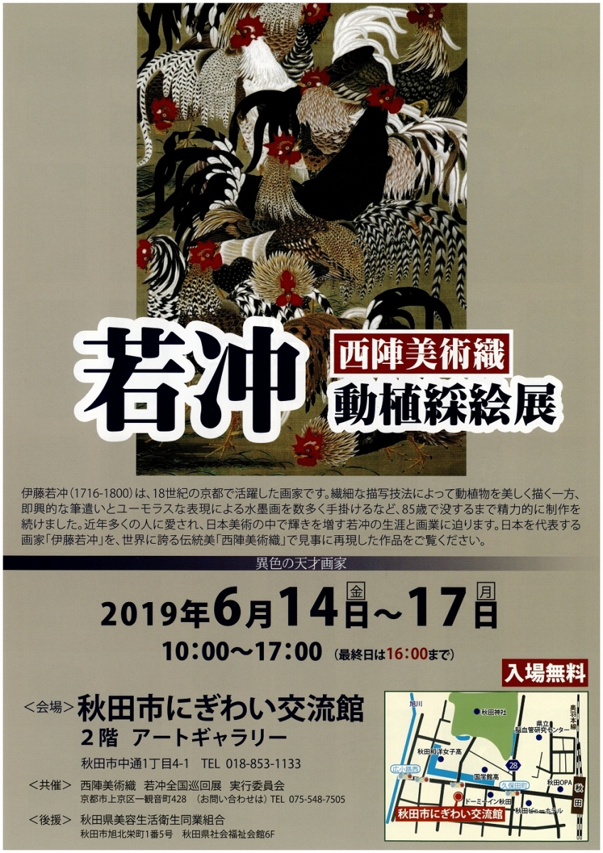若冲 西陣美術織 動植綵絵展 期間:2019年06月14日 ~ 2019年06月17日 開催日:2019年6月14日(金)~17日(月) 時 間:10:00~17:00(最終日は16:00まで) 会 場:にぎわい交流館AU 2F アートギャラリー 入 場:無料