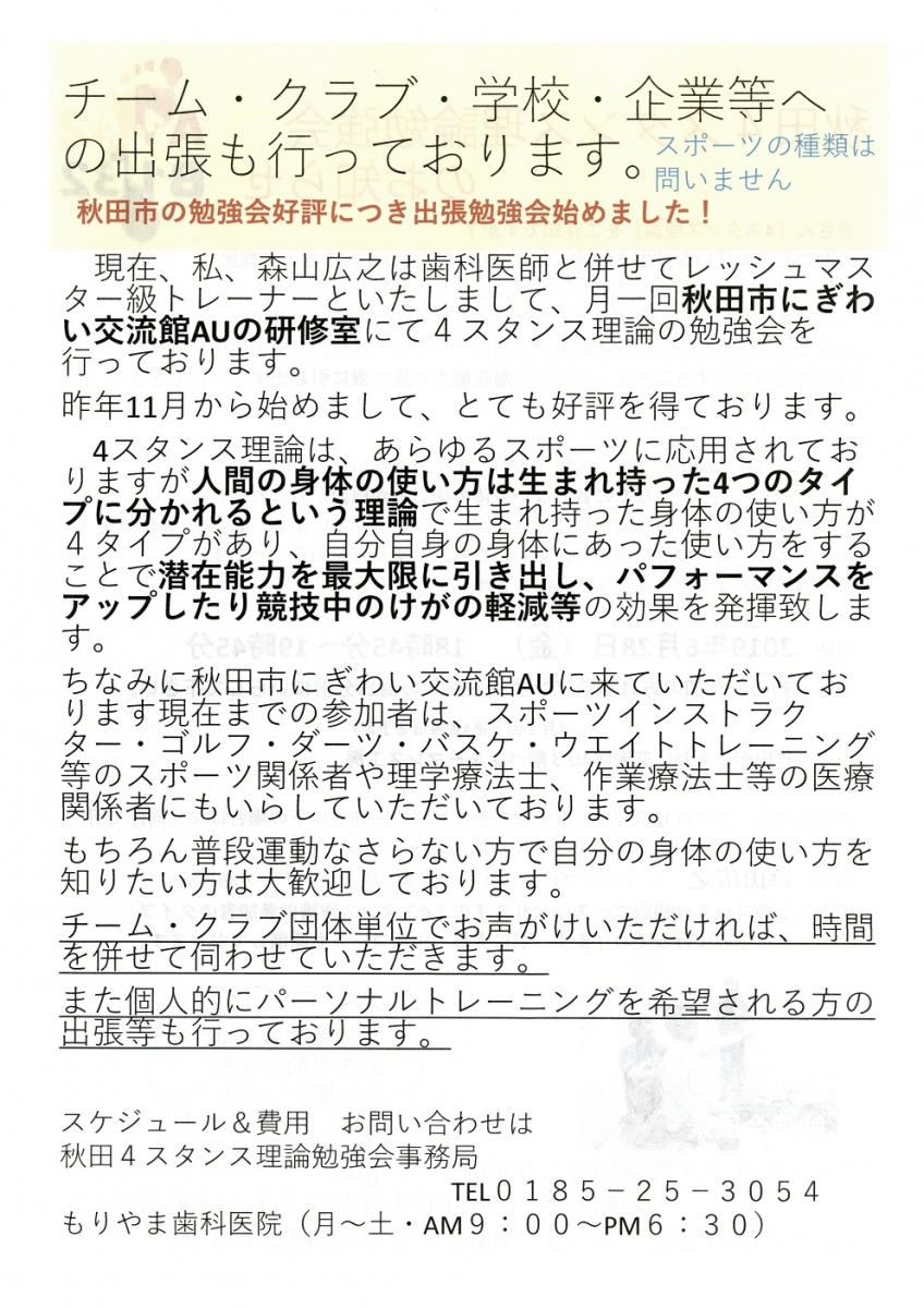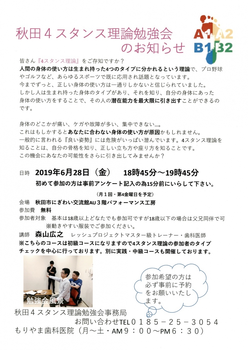秋田4スタンス理論勉強会のお知らせ 期間:2019年06月28日 開催日:2019年6月28日(金) 時 間:18:45~19:45 初めて参加の方は事前アンケート記入の為15分前にいらして下さい。 (月1回・第4金曜日を予定) 会 場:にぎわい交流館AU 3F パフォーマンス工房2 参 加:無料 参加希望の方は必ず事前に予約をお願いいたします。 参加者対象:基本は18歳以上どなたでも参加可ですが、18歳以下の場合は父兄同伴で可 ※動きやすい服装でご参加ください。 問合せ:秋田4スタンス理論勉強会事務局 TEL 0185-25-3054 もりやま歯科医院(月~土・AM9:00~PM6:30)