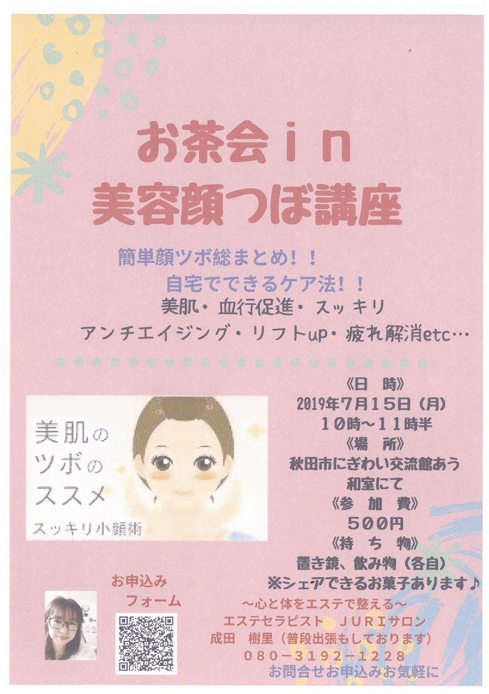 お茶会 in 美容顔つぼ講座 期間:2019年07月15日 開催日:2019年7月15日(日) 時 間:10:00~11:30 会 場:にぎわい交流館AU 4F 和室1 参加費:500円 持ち物:置き鏡、飲み物(各自) ※シェアできるお菓子あります♪ 問合せ:エステセラピスト JURIサロン 成田 樹里 TEL 080-3192-1228
