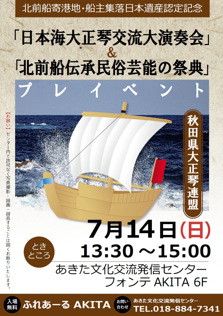 「日本海大正琴交流大演奏会」&「北前船伝承民俗芸能の祭典」プレイベント 期間:2019年07月14日 「北前船寄港地・船主集落」が日本遺産に認定された記念として、港ばやしや踊り、民謡を披露します。北前船から伝承された文化や交流の軌跡を詰め込んだ豪華なステージをご堪能ください。 開催日:2019年7月14日(日) 時 間:13:30~15:00 会 場:フォンテAKITA6F あきた文化交流発信センター「ふれあーるAKITA」 出 演:秋田県大正琴連盟 入場料:無料 問合せ先:ふれあーるAKITA Tel 018-884-7341
