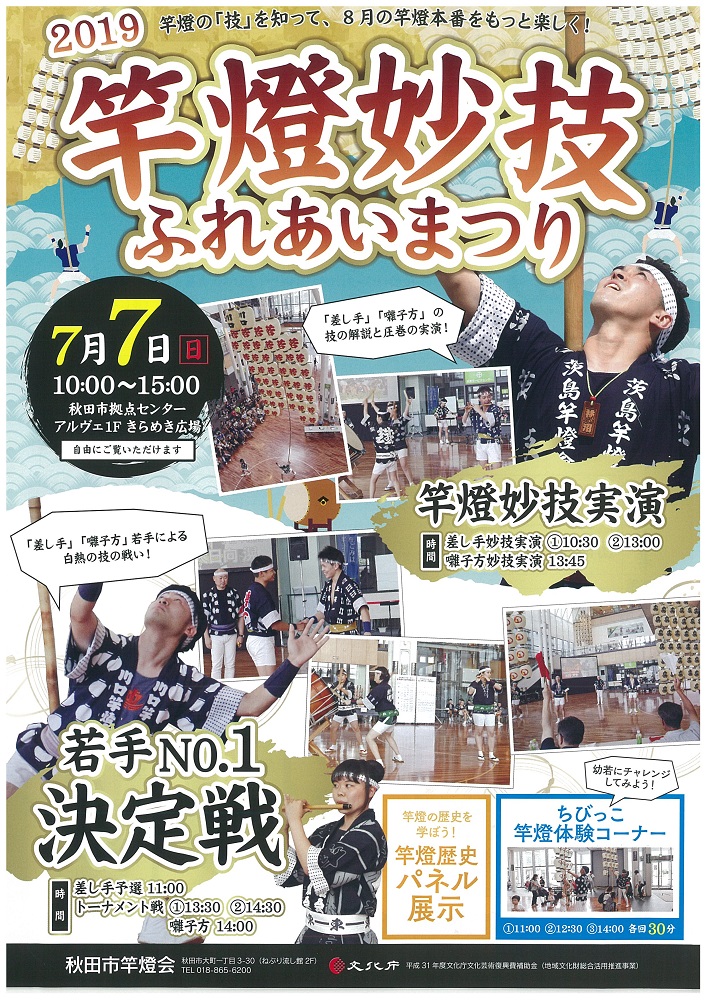 竿燈妙技ふれあいまつり 期間:2019年07月07日 開催日:2019年7月7日(日) 時 間:10:00~15:00 会 場:秋田拠点センターアルヴェ1階 きらめき広場 問合せ先:秋田市竿燈会 TEL 018-865-6200 ※自由にご覧いただけます。