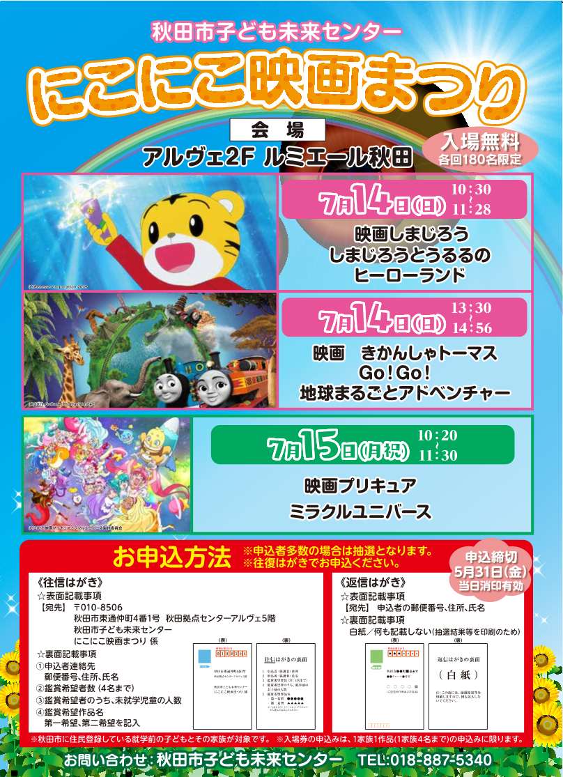 - 問合せ先:秋田市子ども未来センター(アルヴェ5階)TEL 887-5340