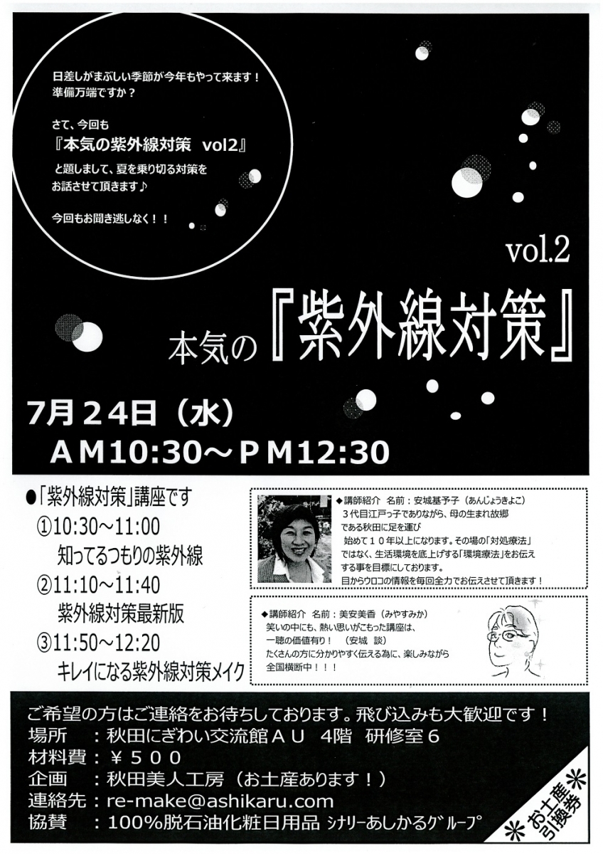 本気の「紫外線対策」Vol.2 期間:2019年07月24日 開催日:2019年7月24日(水) 時 間:10:30~12:30 会 場:にぎわい交流館AU 4F 研修室6 材料費:500円 企 画:秋田美人工房(お土産あります!) 連絡先:re-make@ashikaru.com