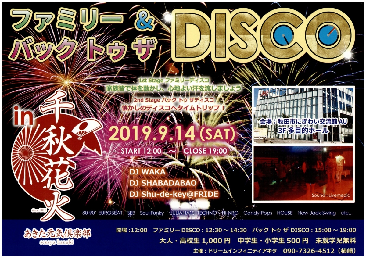 ファミリー&バック トゥ ザ DISCO in 千秋花火 期間:2019年09月14日 開催日:2019年9月14日(土) 時 間:開場 12:00 ファミリーDISCO 12:30~14:30 バック トゥ ザ DISCO 15:00~19:00 入場料:大人・高校生 1,000円 中学生・小学生 500円 未就学児 無料 主 催:ドリームインフィニティアキタ 090-7326-4512(柿崎)