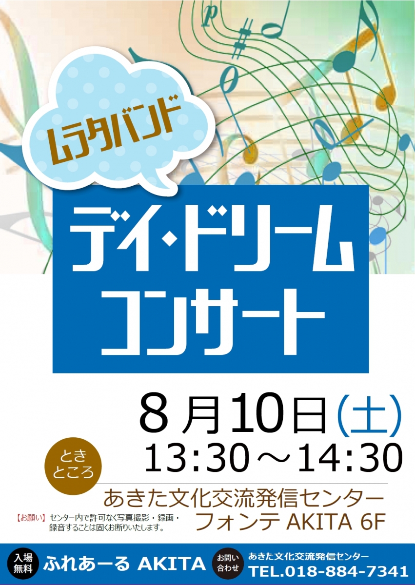 デイ・ドリームコンサート 期間:2019年08月10日 ギター、ドラム、ベース、キーボードのバンド演奏で人気のJPOPSを歌います。中高年世代へのエールとして披露するオリジナルソングにもご期待ください。主な曲目は「君が去った街」「Go back home」「夢をあきらめないで」ほか。 開催日:2019年8月10日(土) 時 間:13:30~14:30 会 場:フォンテAKITA6F あきた文化交流発信センター「ふれあーるAKITA」 出 演:ムラタバンド 問合せ先:ふれあーるAKITA Tel 018-884-7341