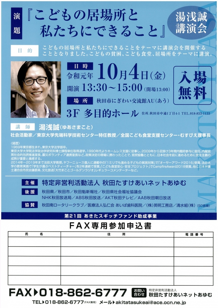 湯浅誠講演会「こどもの居場所と私たちにできること」 期間:2019年10月04日 開催日:2019年10月4日(金) 時 間:開演13:30~15:00(開場13:00) 会 場:にぎわい交流館AU 3F 多目的ホール 入 場:無料 問合せ:特定非営利活動法人 秋田たすけあいネットあゆむ TEL/FAX 018-862-6777 mail akitatasukeai@ace.ocn.ne.jp
