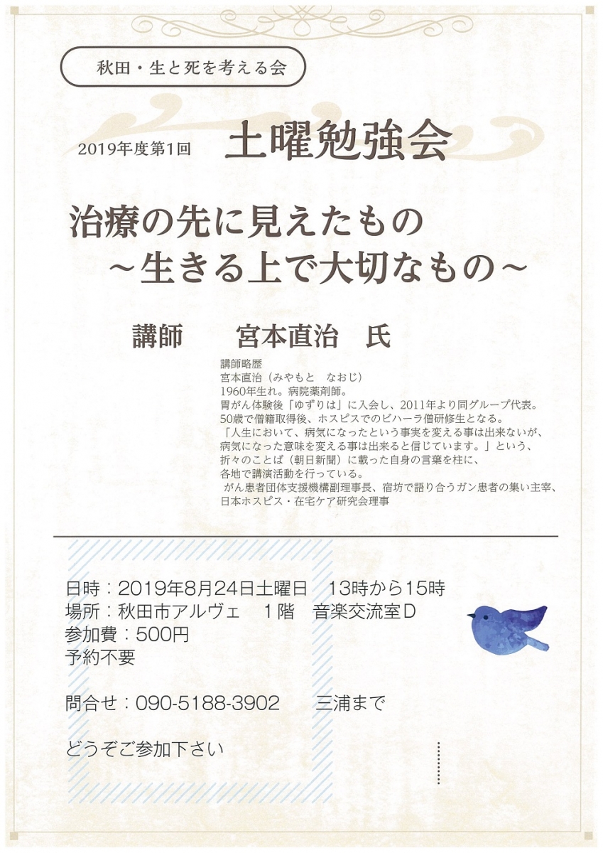 土曜勉強会 治療の先に見えたもの~生きる上で大切なもの~ 期間:2019年08月24日 開催日:2019年8月24日(土) 時 間:13:00~15:00 会 場:秋田拠点センターアルヴェ1階 音楽交流室D 参加費:500円 問合せ先:秋田・生と死を考える会 三浦 TEL 090-5188-3902