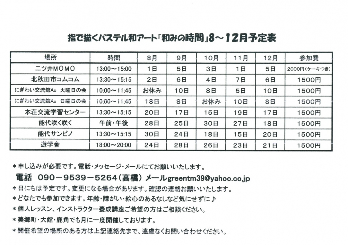 - 問合せ:パステル和(NAGOMI)アートインストラクター 高橋みどり