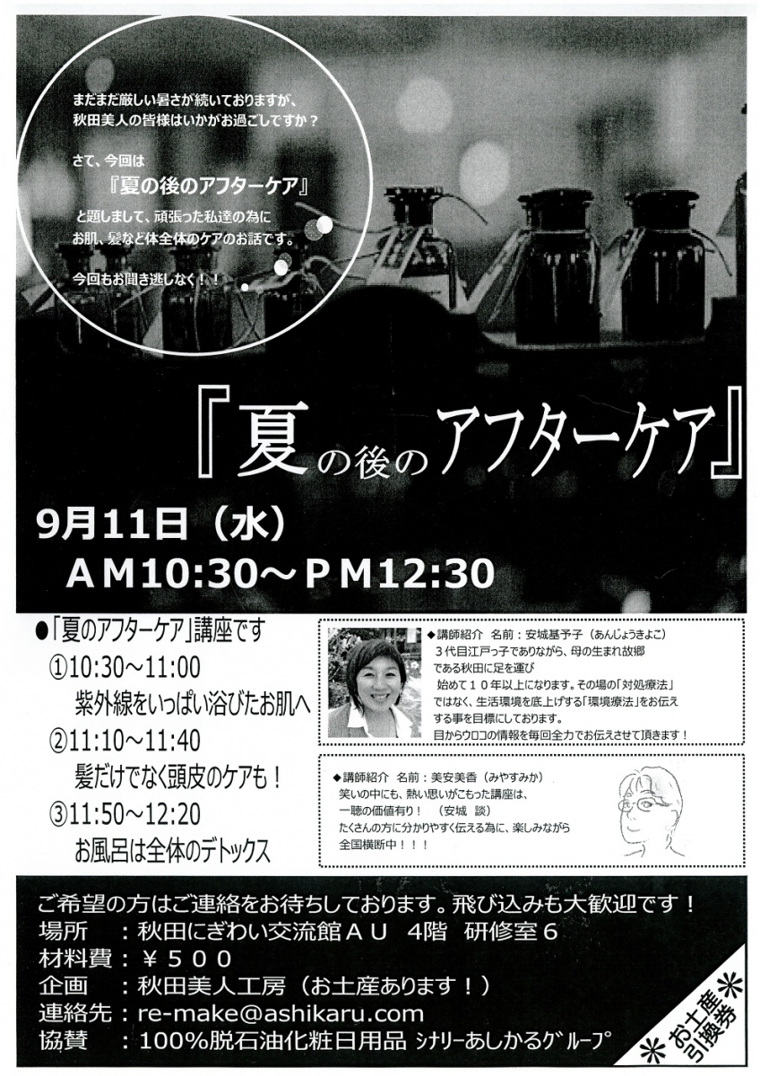 夏の後のアフターケア 期間:2019年09月11日 開催日:2019年9月11日(水) 時 間:10:30~12:30 会 場:にぎわい交流館AU 4F 研修室6 材料費:¥500 企 画:秋田美人工房(お土産あります!) 連絡先:re-make@ashikaru.com