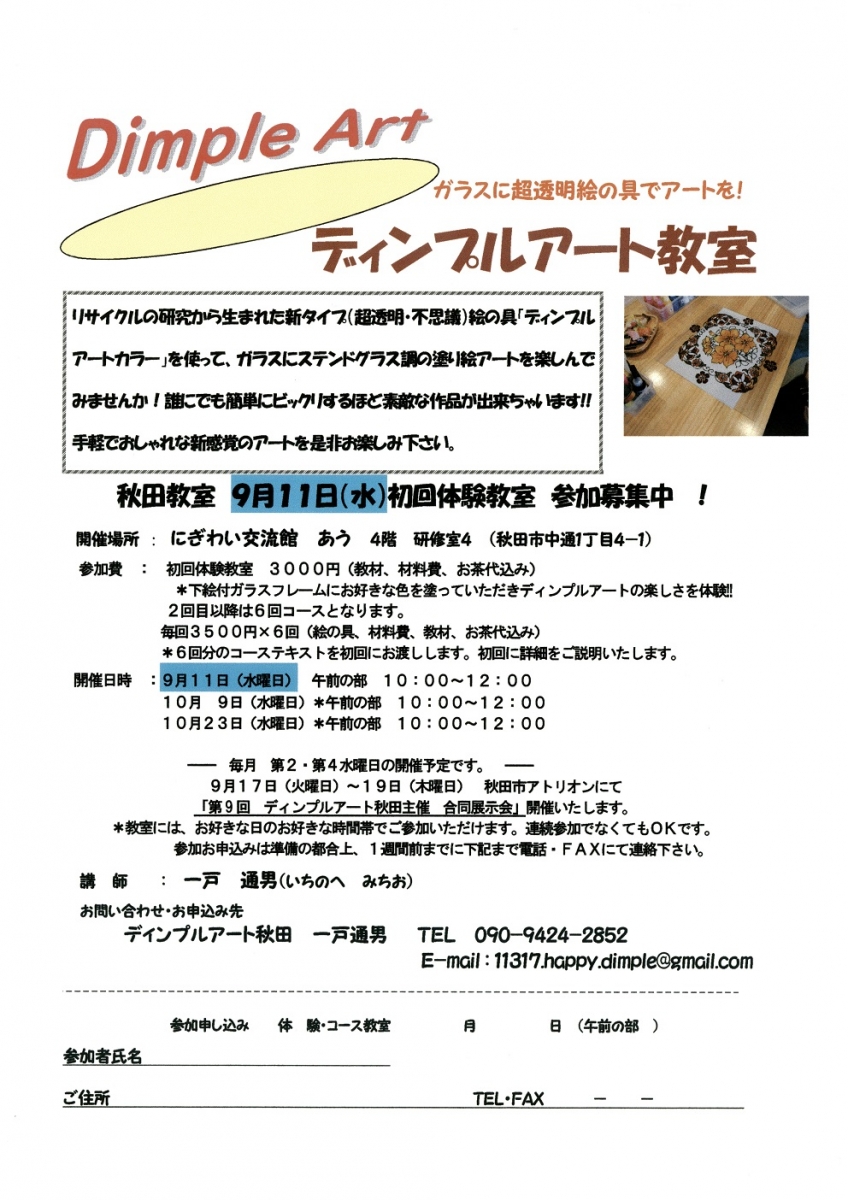 ディンプルアート教室 期間:2019年09月11日 開催日:2019年9月11日(水) 時 間:10:00~12:00 会 場:にぎわい交流館AU 4F 研修室4 参加費:初回体験教室3,000円(教材、材料費、お茶代込み) 問合せ・申込:ディンプルアート秋田 一戸道男 TEL 090-9424-2852 E-mail 11317.happy.dimple@gmail.com