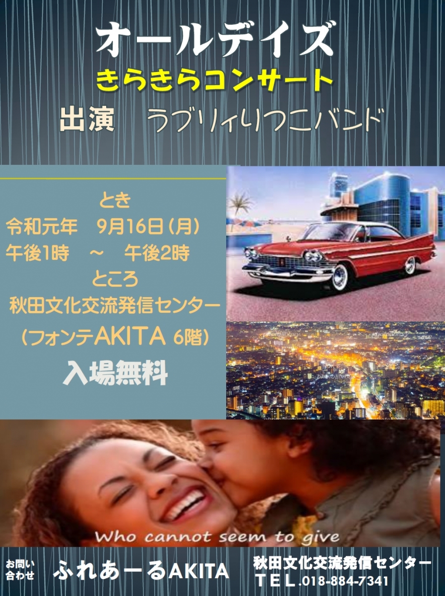 オールディーズきらきらコンサート 期間:2019年09月16日 8名編成のバンドで、1950年代から1960年代にヒットした洋楽を披露します。伸びやかな声と魅力的な生演奏で、オールディーズの世界に浸ってみませんか? 開催日:2019年9月16日(月・祝) 時 間:13:00~14:00 会 場:フォンテAKITA6F あきた文化交流発信センター「ふれあーるAKITA」 出 演:ラブリィりつこバンド 入場料:無料 問合せ先:ふれあーるAKITA Tel 018-884-7341