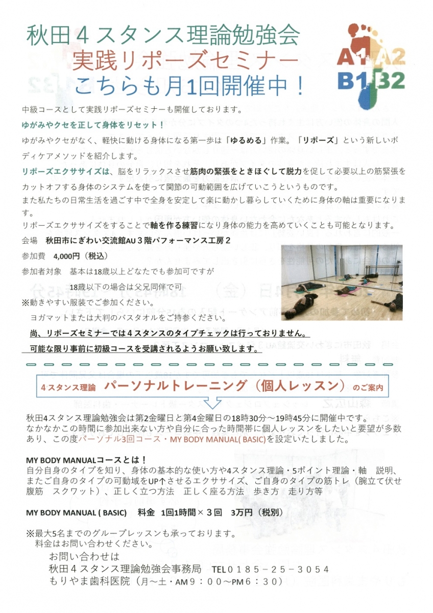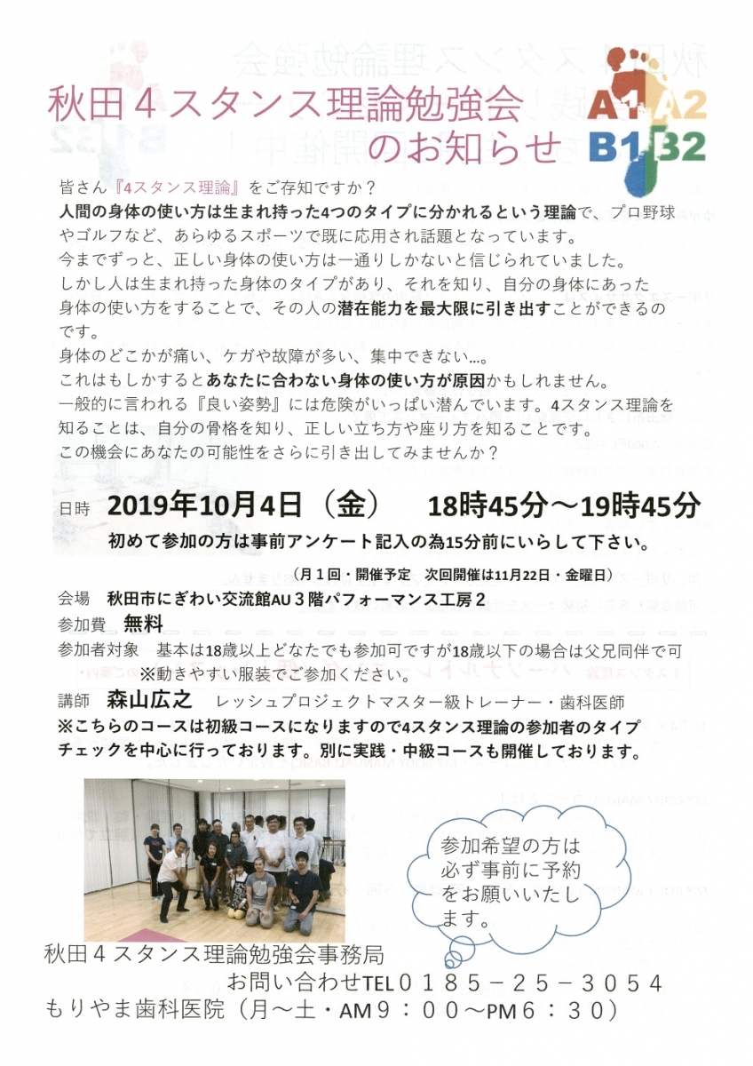 秋田4スタンス理論勉強会のお知らせ 期間:2019年10月04日 開催日:2019年10月4日(金) 時 間:18:45~19:45 初めて参加の方は事前アンケート記入の為15分前にいらしてください。 (月1回・開催予定 次回開催は11月22日・金曜日) 会 場:にぎわい交流館AU 3F パフォーマンス工房2 参 加:無料 参加希望の方は必ず事前に予約をお願いします。 参加対象:基本は18歳以上どなたでも参加可ですが18歳以下の場合は父兄同伴で可 ※動きやすい服装でご参加ください。 問合せ:秋田4スタンス理論勉強会事務局 TEL 0185-25-3054 もりやま歯科医院(月~土・AM9:00~PM6:30)