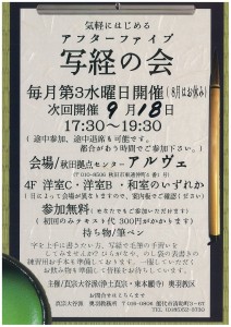気軽にはじめるアフターファイブ 写経の会 期間:2019年09月18日 開催日:2019年9月18日(水) 時 間:17:30~19:30 会 場:秋田拠点センターアルヴェ4階 洋室C-2 料 金:参加無料(初回のみテキスト代300円がかかります) 主 催:真宗大谷派(浄土真宗・東本願寺)奥羽教区 問合せ先:真宗大谷派 奥羽教務所 TEL 0185-52-3730 ☆どなたでもご参加いただけます。