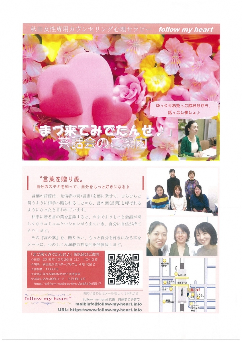 まづ来てみでたんせ♪茶話会 期間:2019年10月26日 開催日:2019年10月26日(土) 時 間:10:00~12:00 会 場:秋田拠点センターアルヴェ4階 和室2 参加費:1,000円 申 込:必要 問合せ先:follow my heart 代表 斉藤まり子 e-mail:info@follow-my-heart.info Webサイト:https://www.follow-my-heart.info/