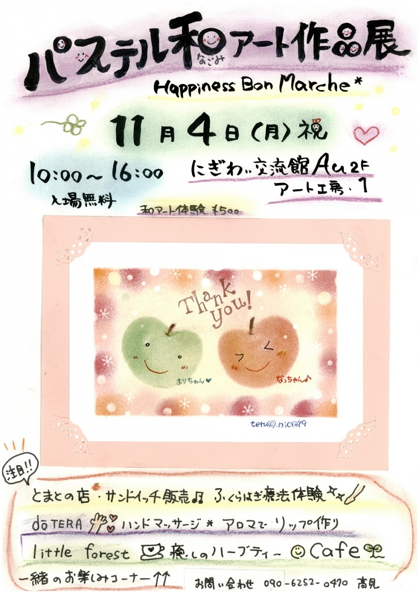 パステル和アート作品展 期間:2019年11月04日 開催日:2019年11月4日(月・祝) 時 間:10:00~16:00 会 場:にぎわい交流館AU 2F アート工房1 入 場:無料 和アート体験¥500 問合せ:090-6252-0470 高見