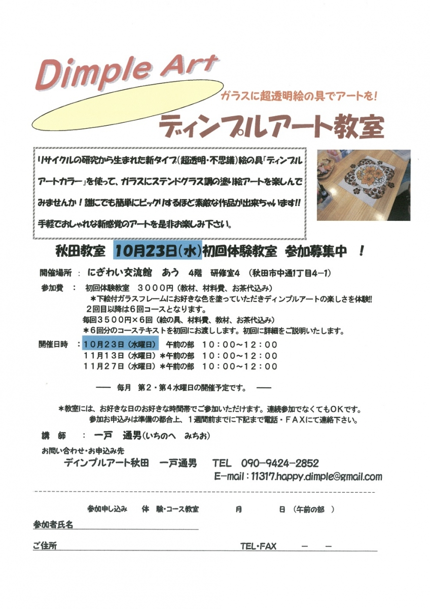 ガラスに超透明絵の具でアートを! ディンプルアート教室 期間:2019年10月23日 開催日:2019年10月23日(水) 時 間:10:00~12:00 会 場:にぎわい交流館AU 4F 研修室4 参加費:初回体験教室 3,000円(教材、材料費、お茶代込み) 問合せ:ディンプルアート秋田 一戸通男 TEL 090-9424-2852 E-mail 11317.happy.dimple@gmail.com