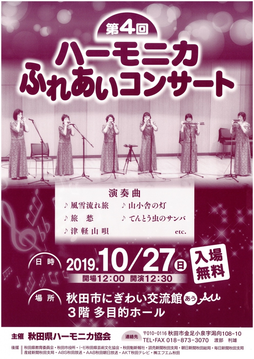 第4回 ハーモニカふれあいコンサート 期間:2019年10月27日 開催日:2019年10月27日(日) 時 間:開場12:00/開演12:30 会 場:にぎわい交流館AU 3F 多目的ホール 入 場:無料 主 催:秋田県ハーモニカ協会 連絡先:TEL・FAX 018-873-3070 渡部 利雄