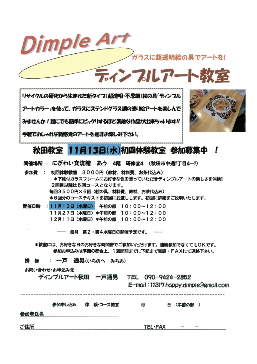 ディンプルアート教室 ガラスに超透明絵の具でアートを! 期間:2019年11月13日 開催日:2019年11月13日(水) 時 間:10:00~12:00 会 場:にぎわい交流館AU 4F 研修室4 参加費:初回体験教室3,000円 (教材、材料費、お茶代込み) 問合せ・申込:ディンプルアート秋田 一戸通男 TEL 090-9424-2852 E-mail 11317.happy.dimple@gmail.com