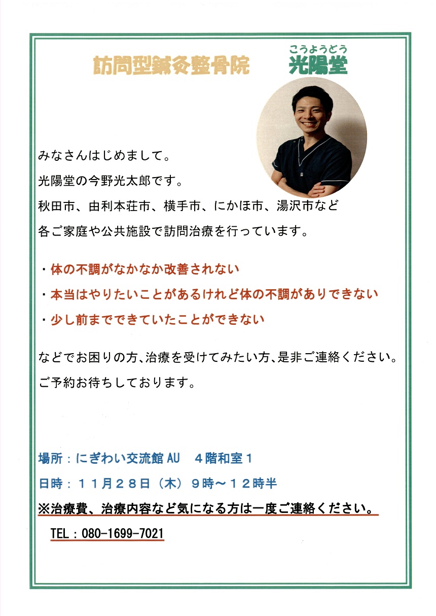 訪問型鍼灸整骨院 光陽堂 期間:2019年11月28日 開催日:2019年11月28日(木) 時 間:9:00~12:30 会 場:にぎわい交流館AU 4F 和室1 ※治療費、治療内容など気になる方は一度ご連絡ください 問合せ:TEL 080-1699-7021