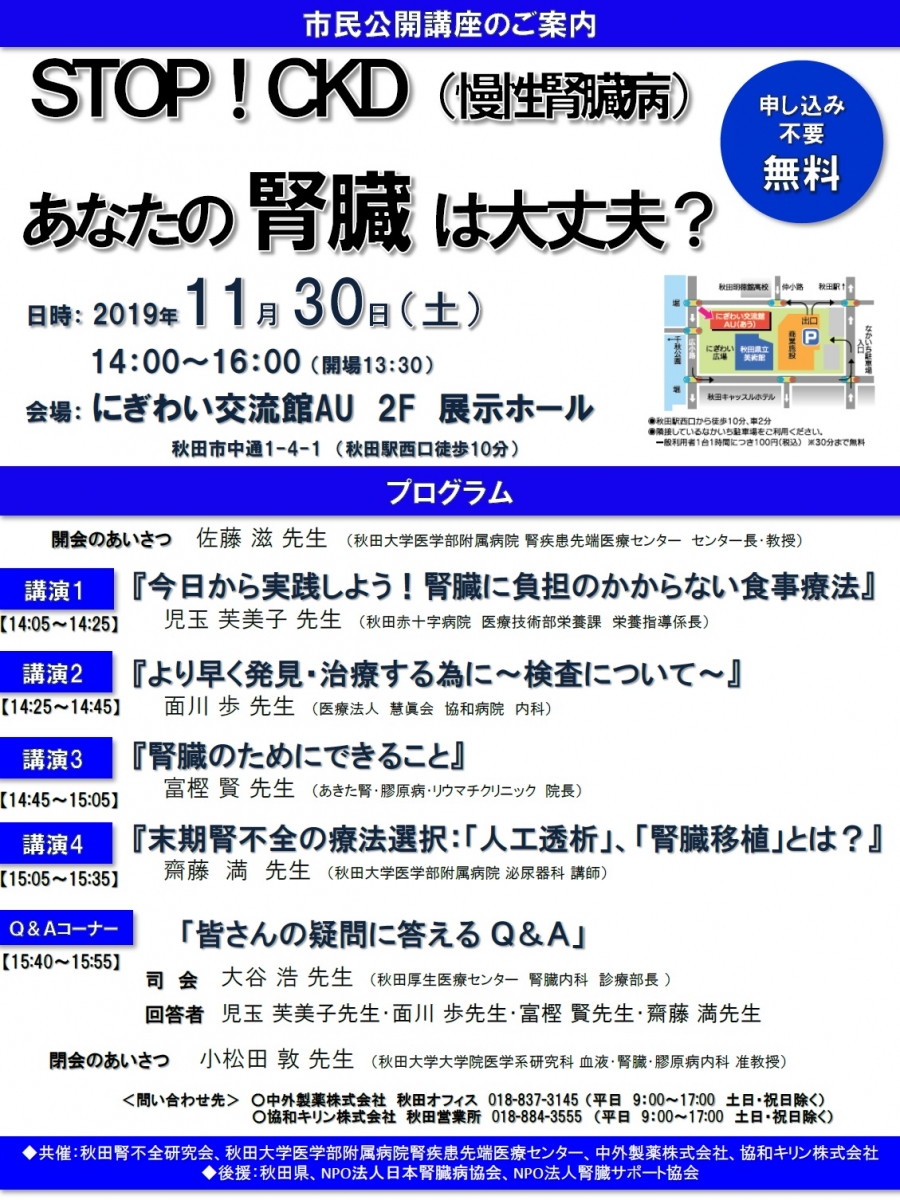 市民公開講座 STOP!CKD(慢性腎臓病) あなたの腎臓は大丈夫? 期間:2019年11月30日 開催日:2019年11月30日(土) 時 間:14:00~16:00(開場13:30) 会 場:にぎわい交流館AU 2F 展示ホール 申 込:不要 参加無料 問合せ:○中外製薬株式会社 秋田オフィス TEL 018-837-3145(平日9:00~17:00 土日・祝日除く) ○協和キリン株式会社 秋田営業所 TEL 018-884-3555(平日9:00~17:00 土日・祝日除く)
