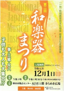 第二回和楽器まつり 期間:2019年12月01日 開催日:2019年12月1日(日) 時 間:開場 13:00 開演 13:30(15:30終演予定) 会 場:秋田拠点センターアルヴェ1階 きらめき広場 主 催:秋田県三曲連盟 問合せ先:浅野 018-823-2281